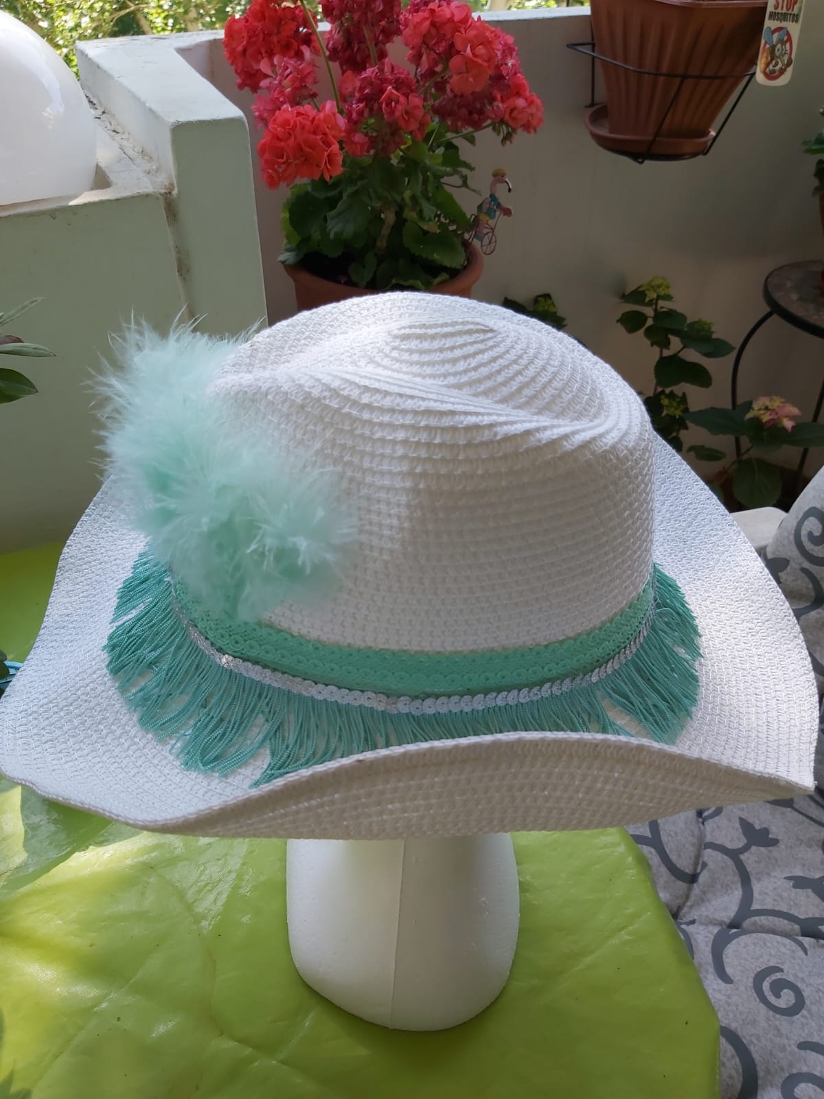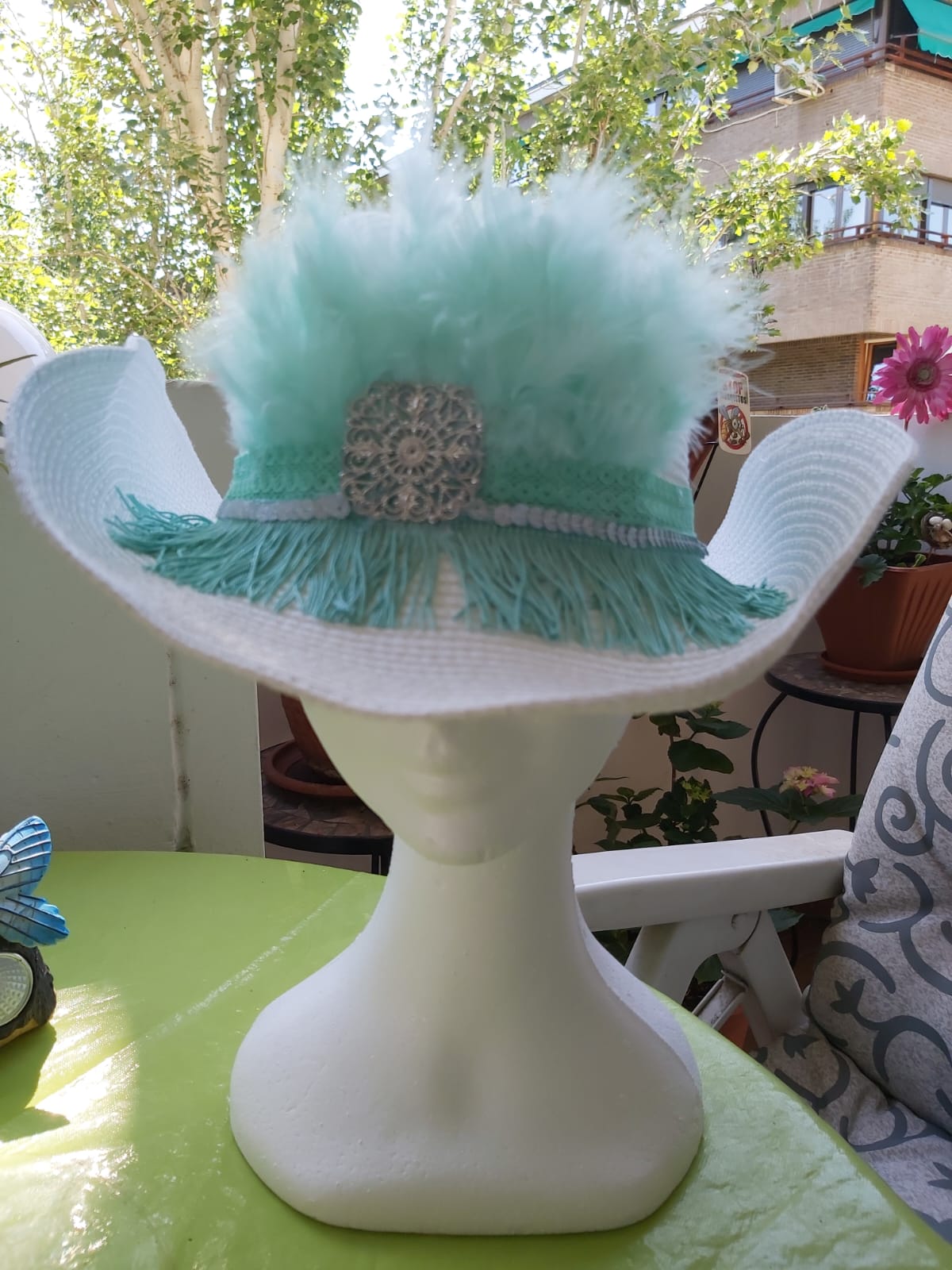 Cowboy blanco con materiales verde agua: plumas, flecos, lentejuelas, tira de algodón