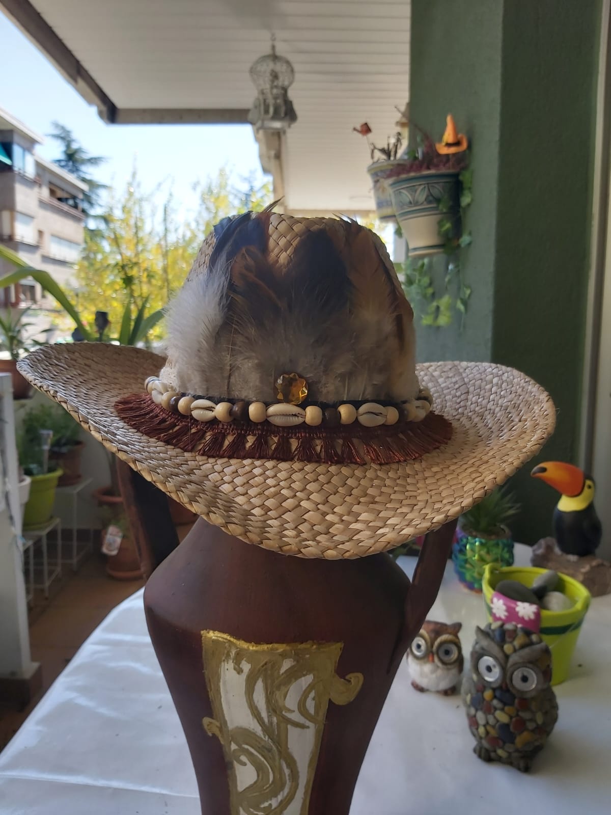 Cowboy camel con materiales: plumas, flecos chocolate, dientes, cuentas de madera