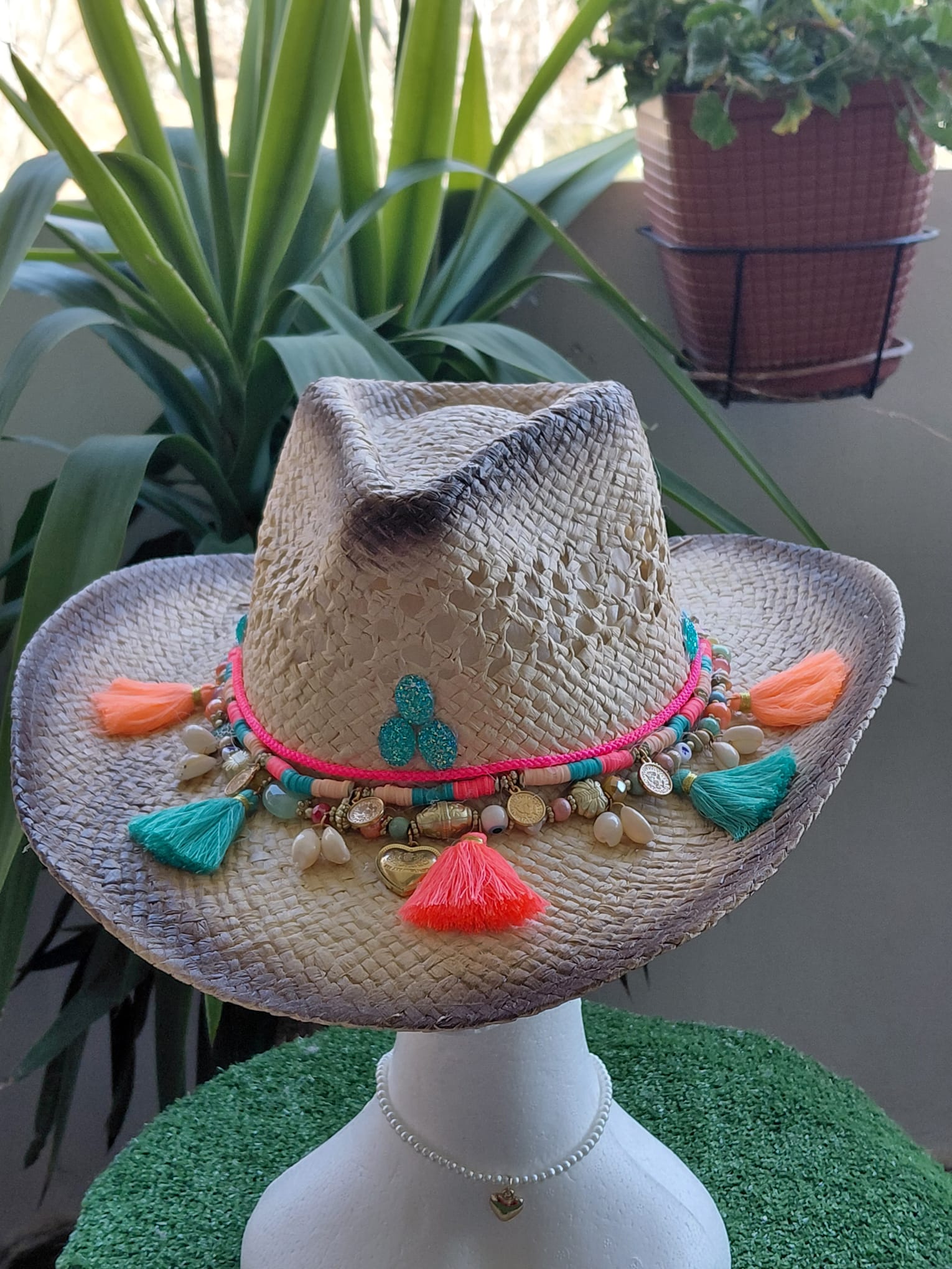 Cowboy con materiales: borlones de algodón verde agua y rosa flúor, dientes, pedrería a tono, cuentas variadas, monedas y corazón metálico dorado