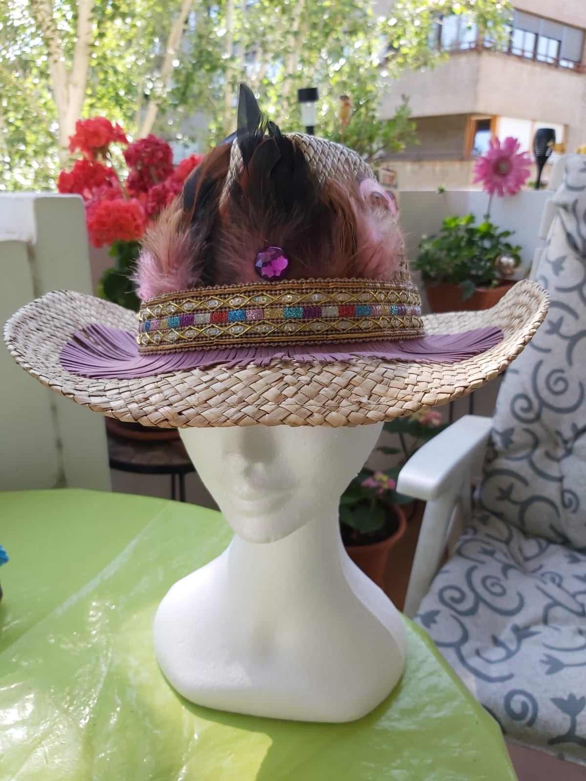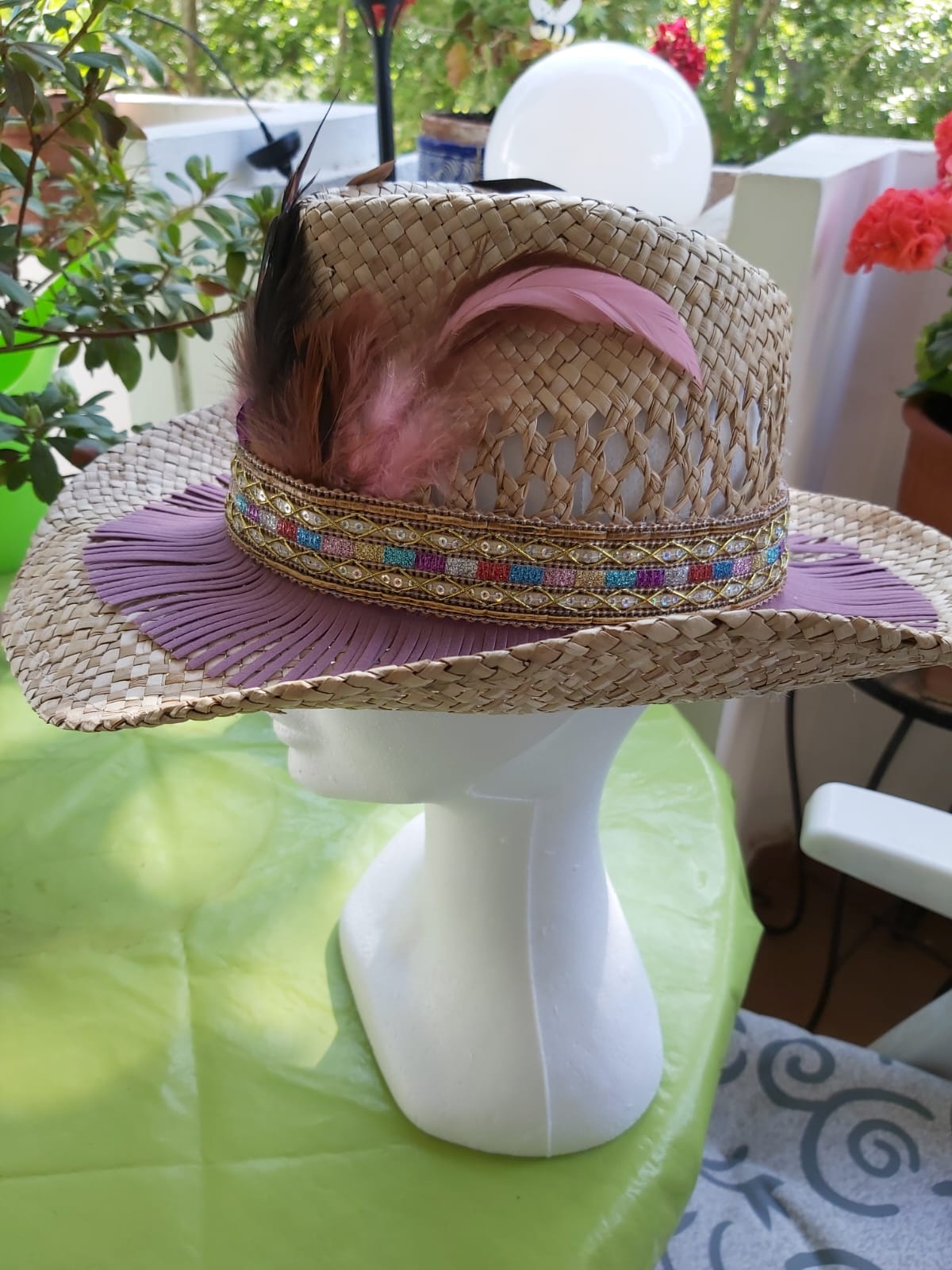 Cowboy en tonos lila y maquillaje con materiales: flecos de ante, plumas, tira rígida fantasía