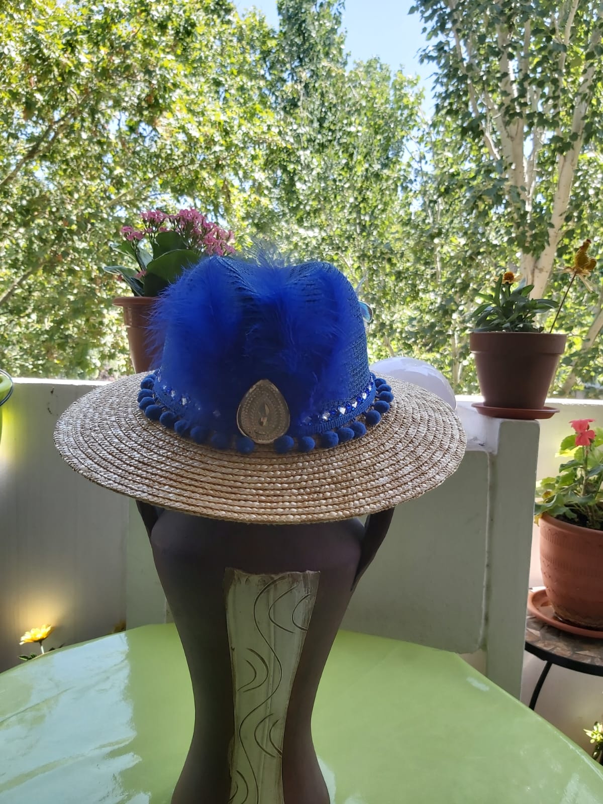 Fedora azulón con materiales: plumas, tira de madroños de algodón azulón, aplique plástico tipo joya, tira de pedrería tipo cristal azulón y diamante