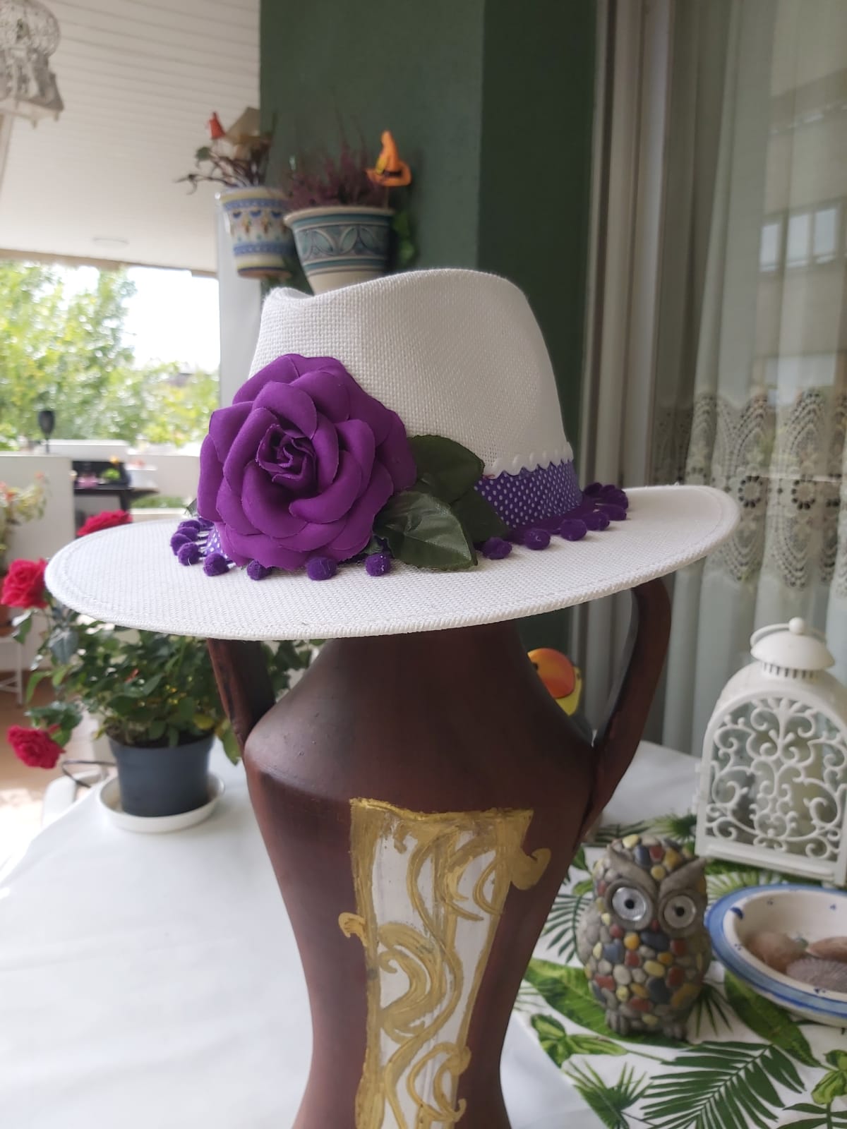 Fedora blanco con materiales morados: flor flamenca, tira de madroños de algodón, tira en zig-zag, lazo ancho raso lunares