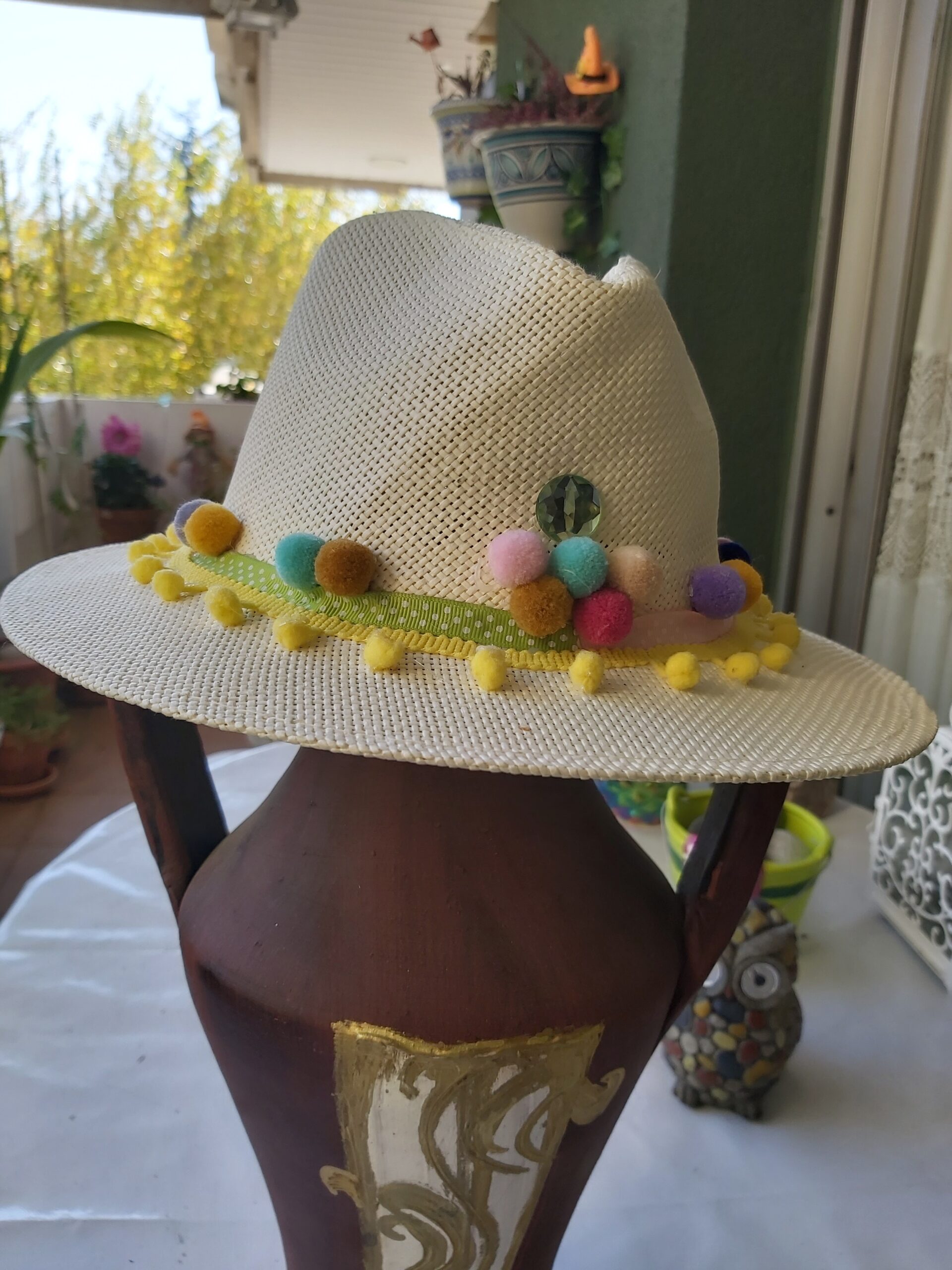 Fedora con materiales: tira de madroños de algodón, bolas de algodón de colores, tira de lunares verde oliva y otros colores