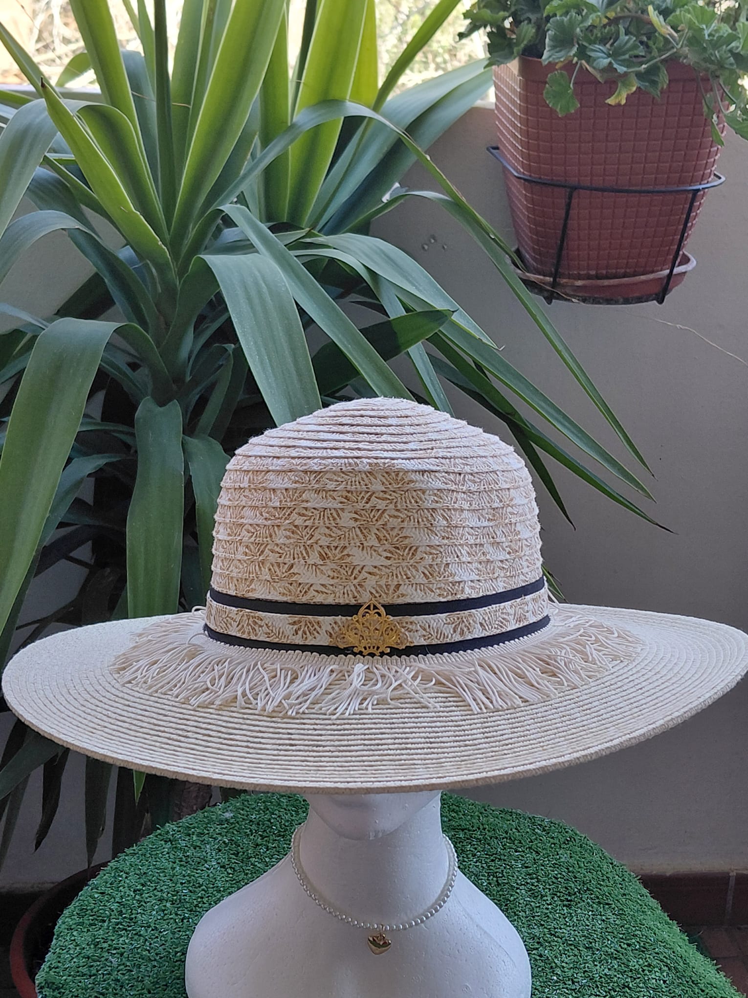 Fedora con materiales: flecos beige, aplique dorado metálico