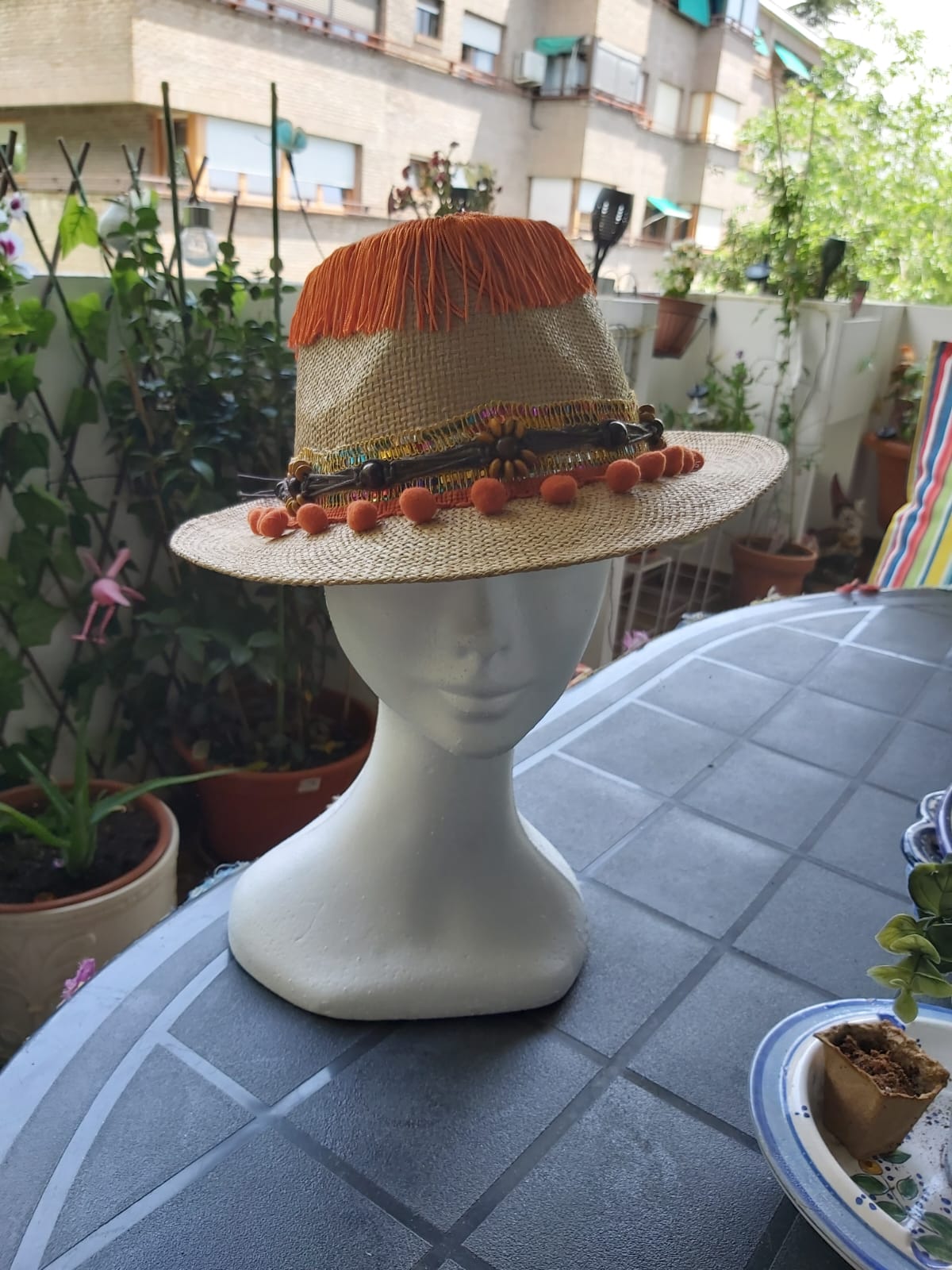 Fedora con materiales: tira de madroños de algodón, flecos, cuentas de madera, simil cuero