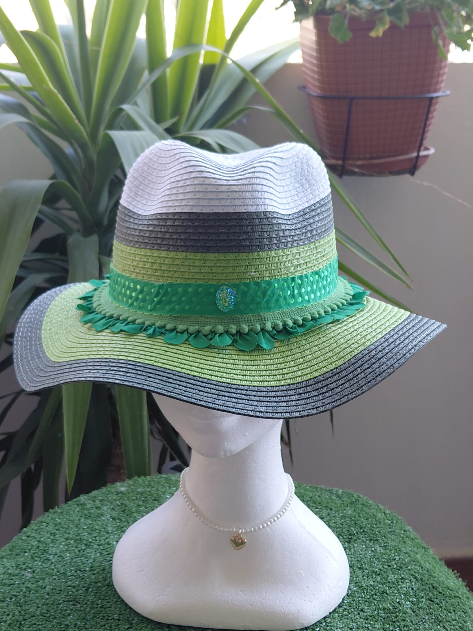 Fedora con materiales: tira de madroños y algodón a tono, tira verde de lunares fantasía y pedrería