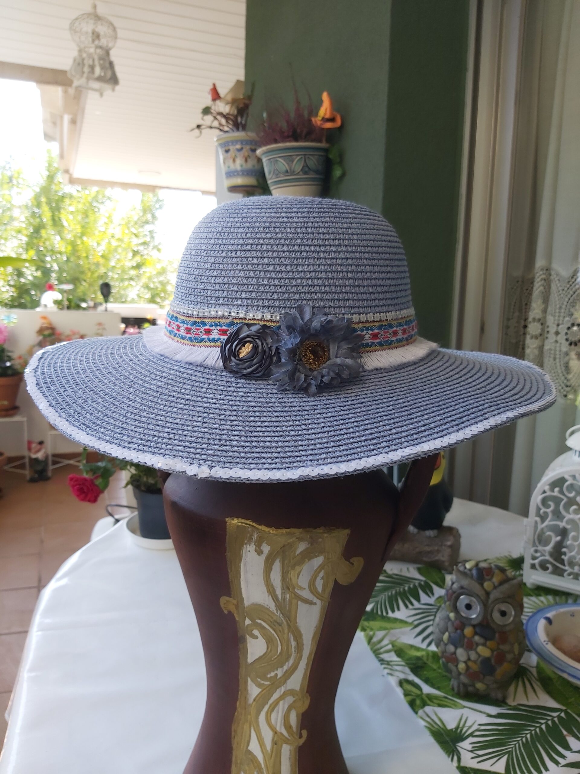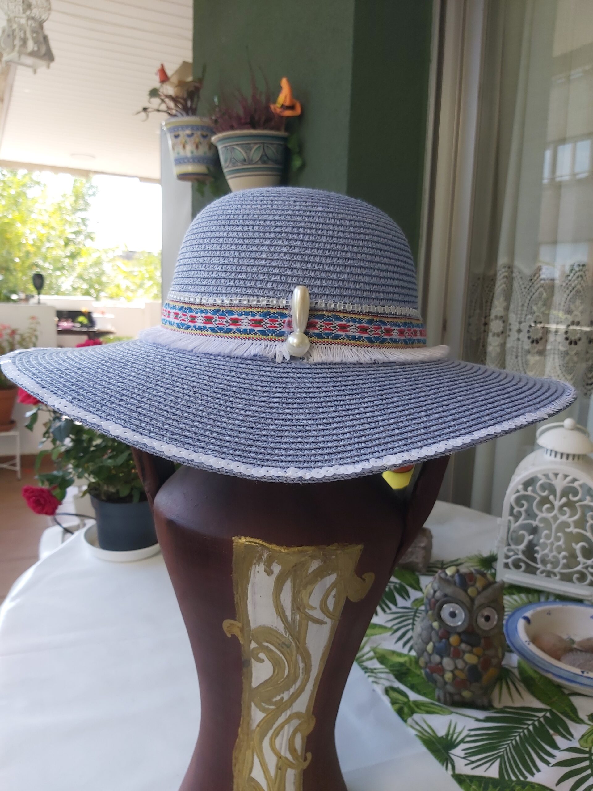 Pamela azul celeste con materiales: perlas, flores de tela, tiras de pasamanería de algodón multicolor con flecos blancos, tira de pedrería blanca