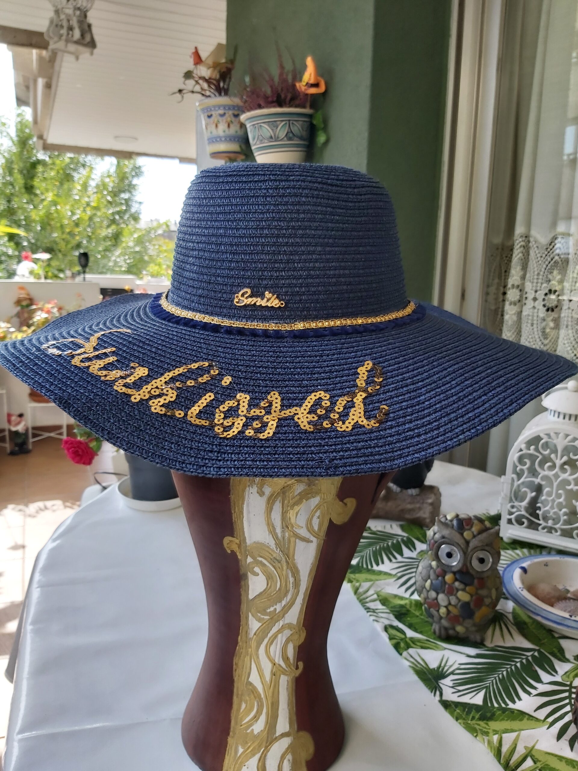 Pamela azul marino con materiales: tira de pasamanería dorada con flecos de algodón, lentejuelas doradas