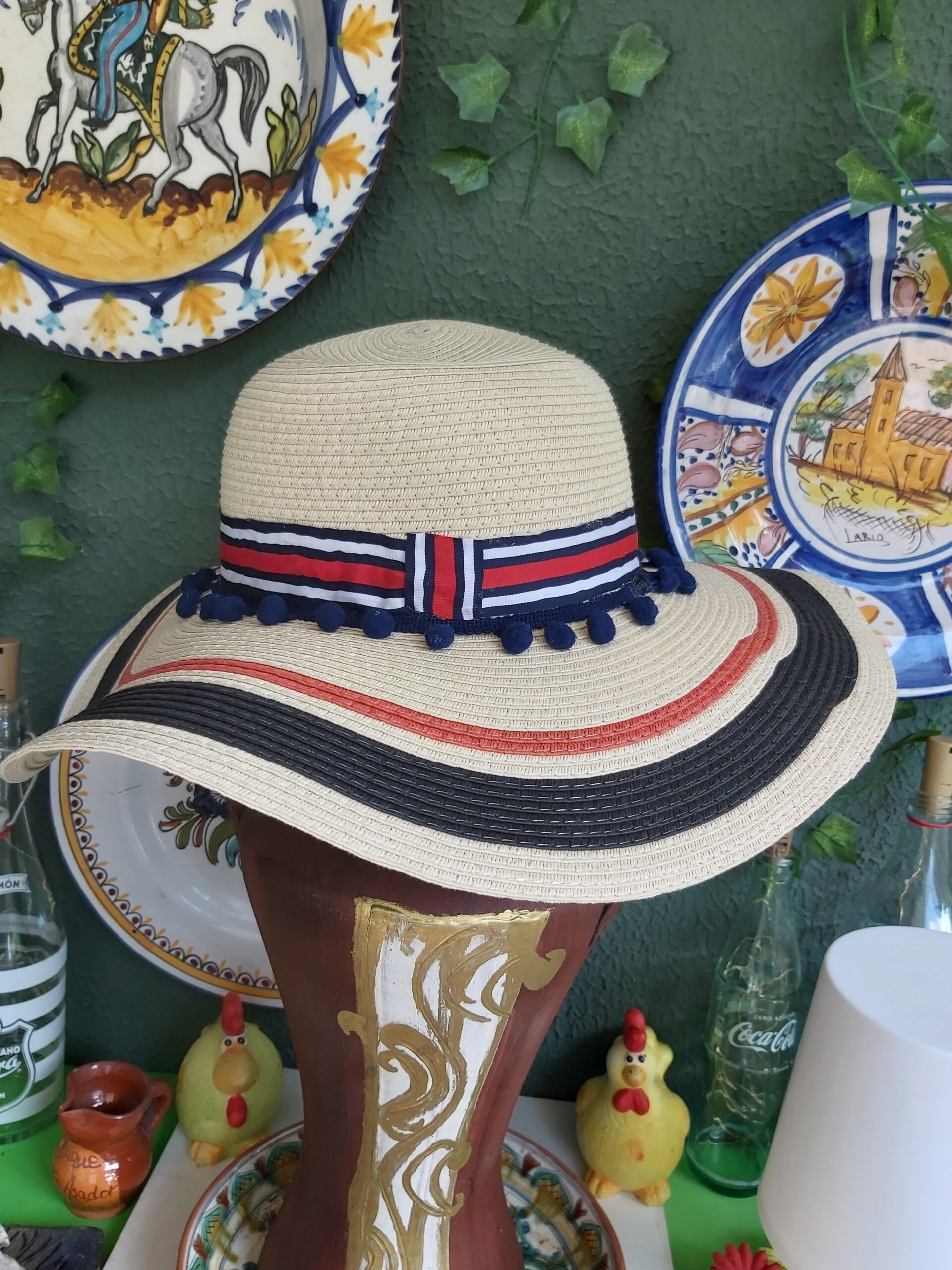 Pamela beige con materiales: tira de madroños de algodón azul marino, tira ancha a rayas a tono con la pamela