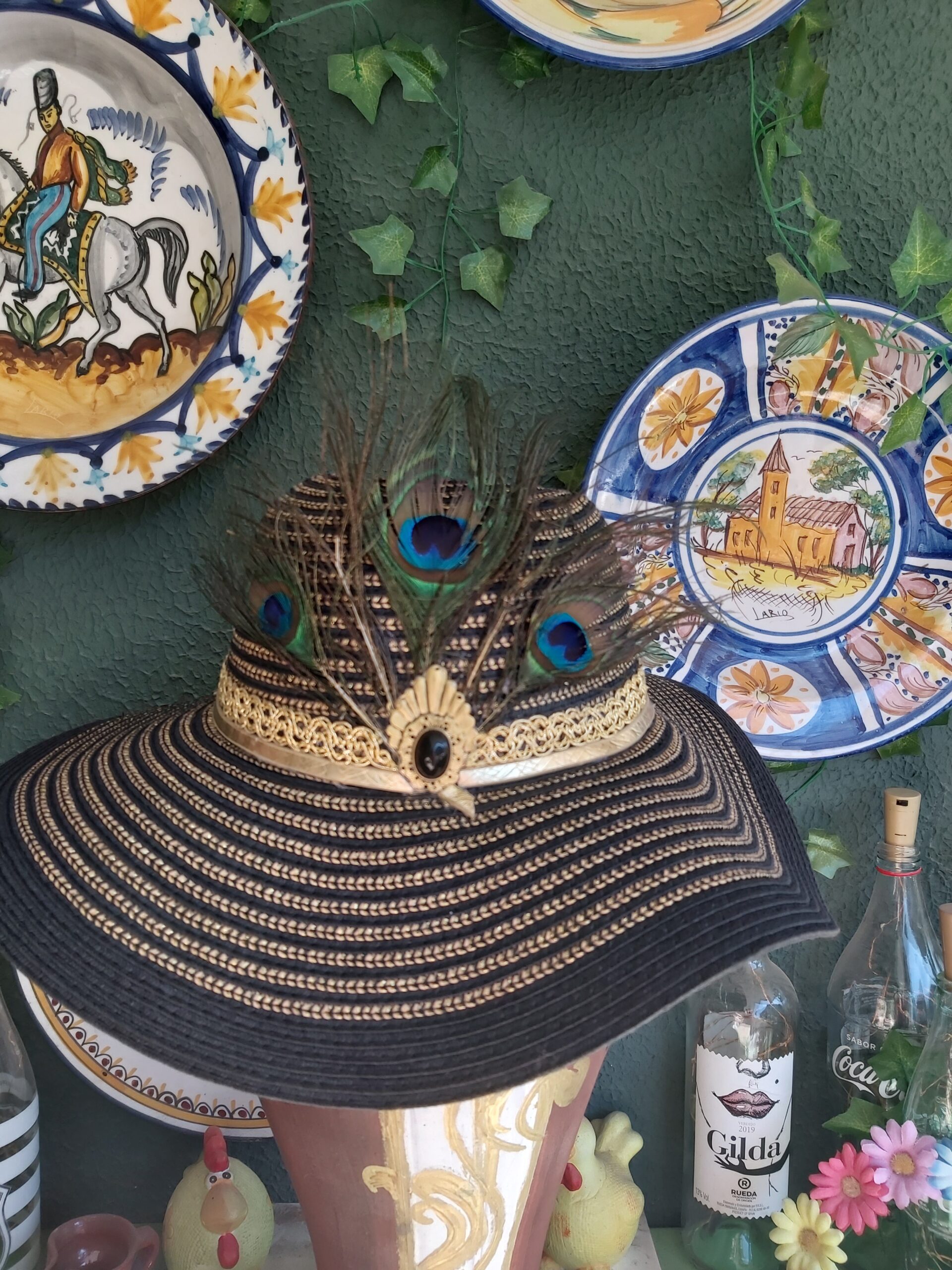 Pamela en tonos negro y camel con materiales: plumas de pavo real, tira simil cuero dorado, tira dorada simil ganchillo, aplique metálico