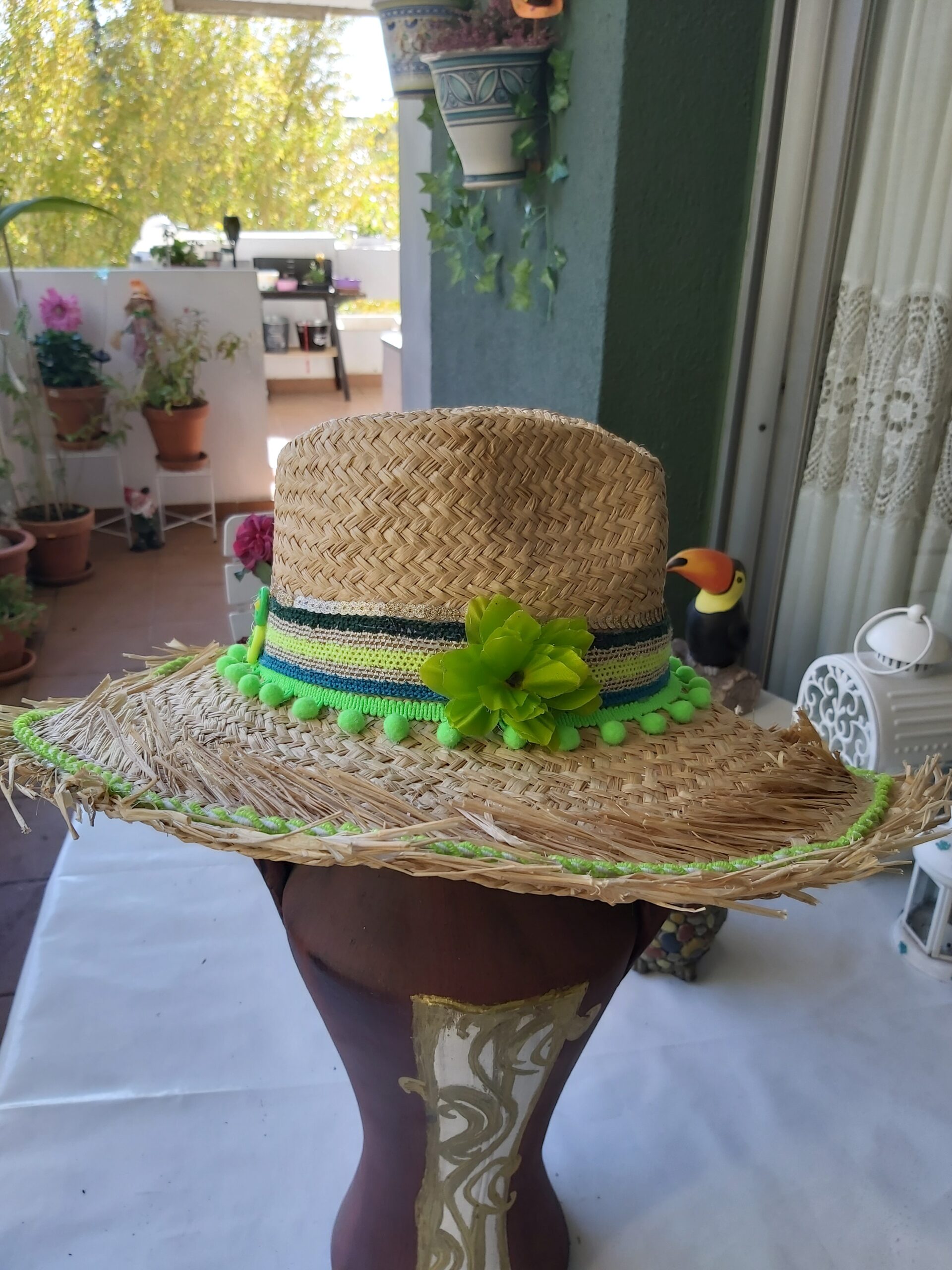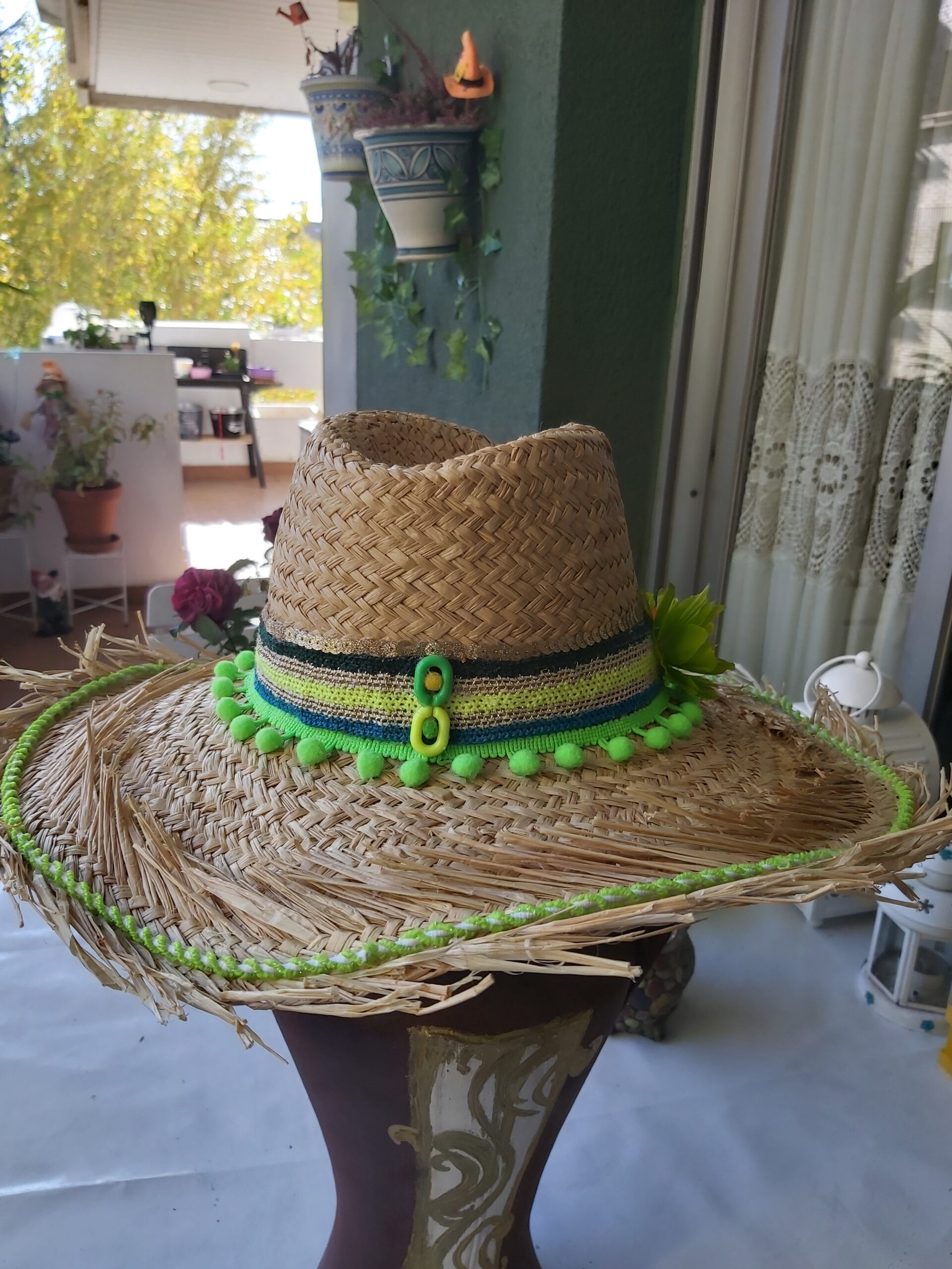 Pamela playera de paja con materiales: tira madroños verde flúor, tira de lentejuelas, tira ancha multicolor tela de saco, tira trenzada de algodón
