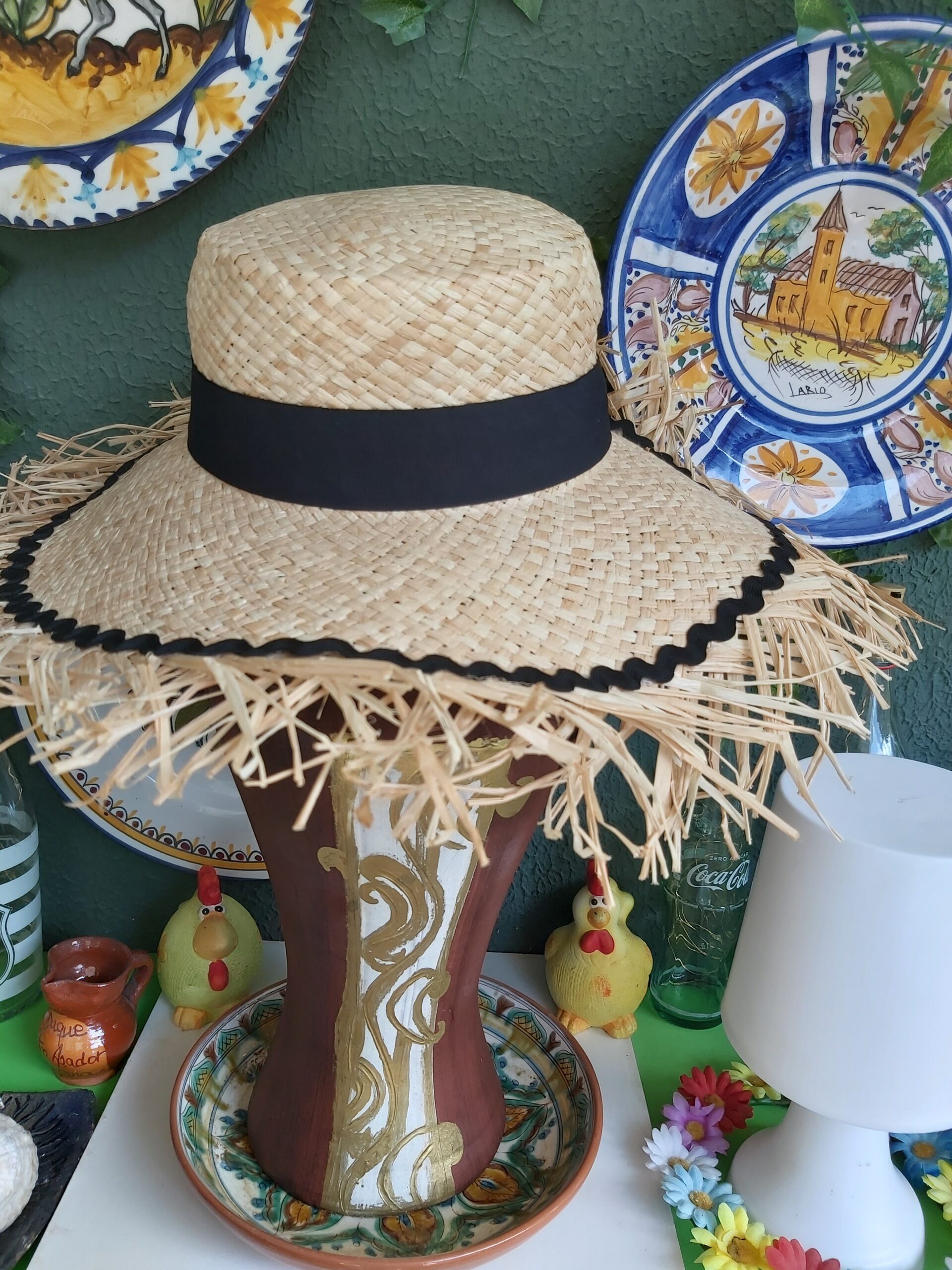 Pamela playera de paja con materiales: tira de algodón en zig-zag tira ancha negra algodón