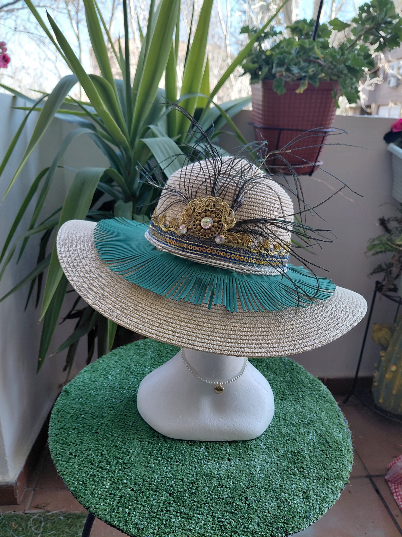 Sombrero beige con materiales: flecos de ante, cordón marfil, tira fashion con lentejuelas, tira dorada simil ganchillo, aplique de plástico pintado en dorado