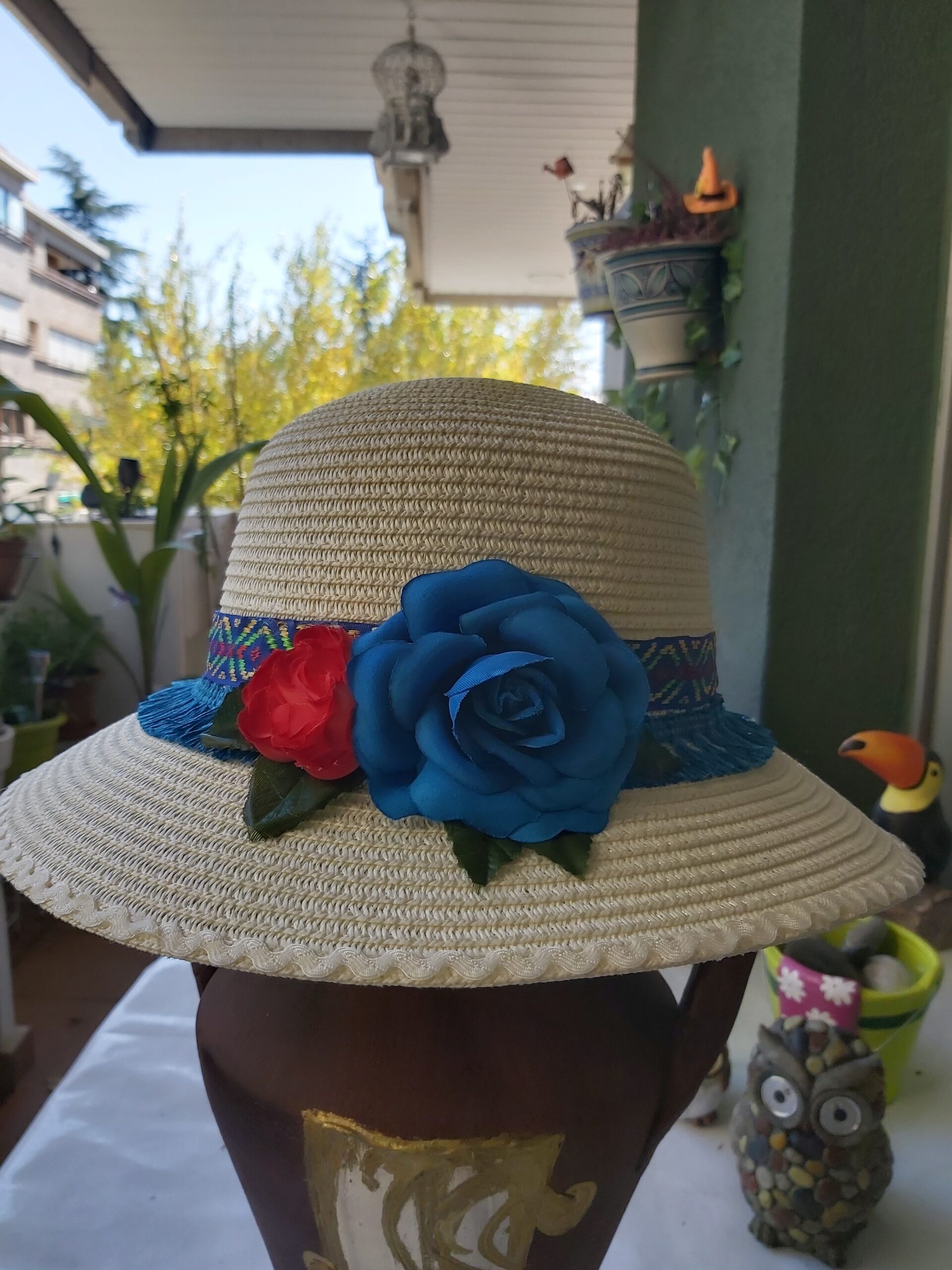 Sombrero beige con materiales: flores de tela azulón y rojo, tira zig-zag beige de algodón, tira de flecos, tira ancha bordados multicolor a tono