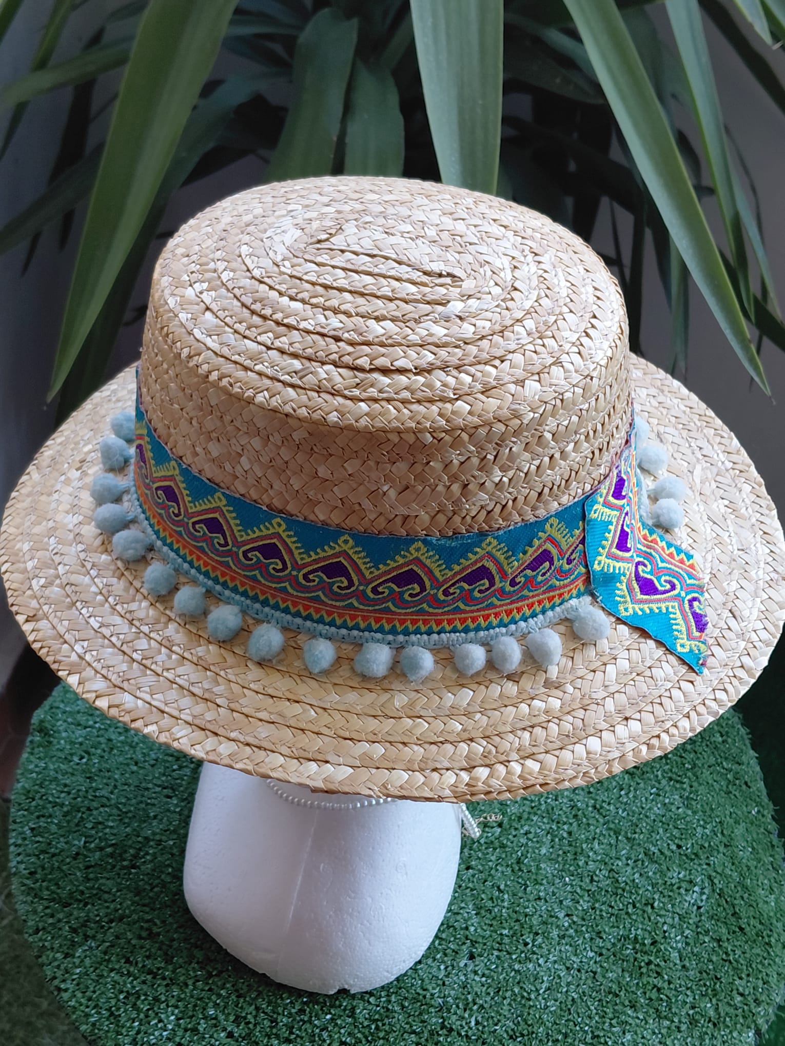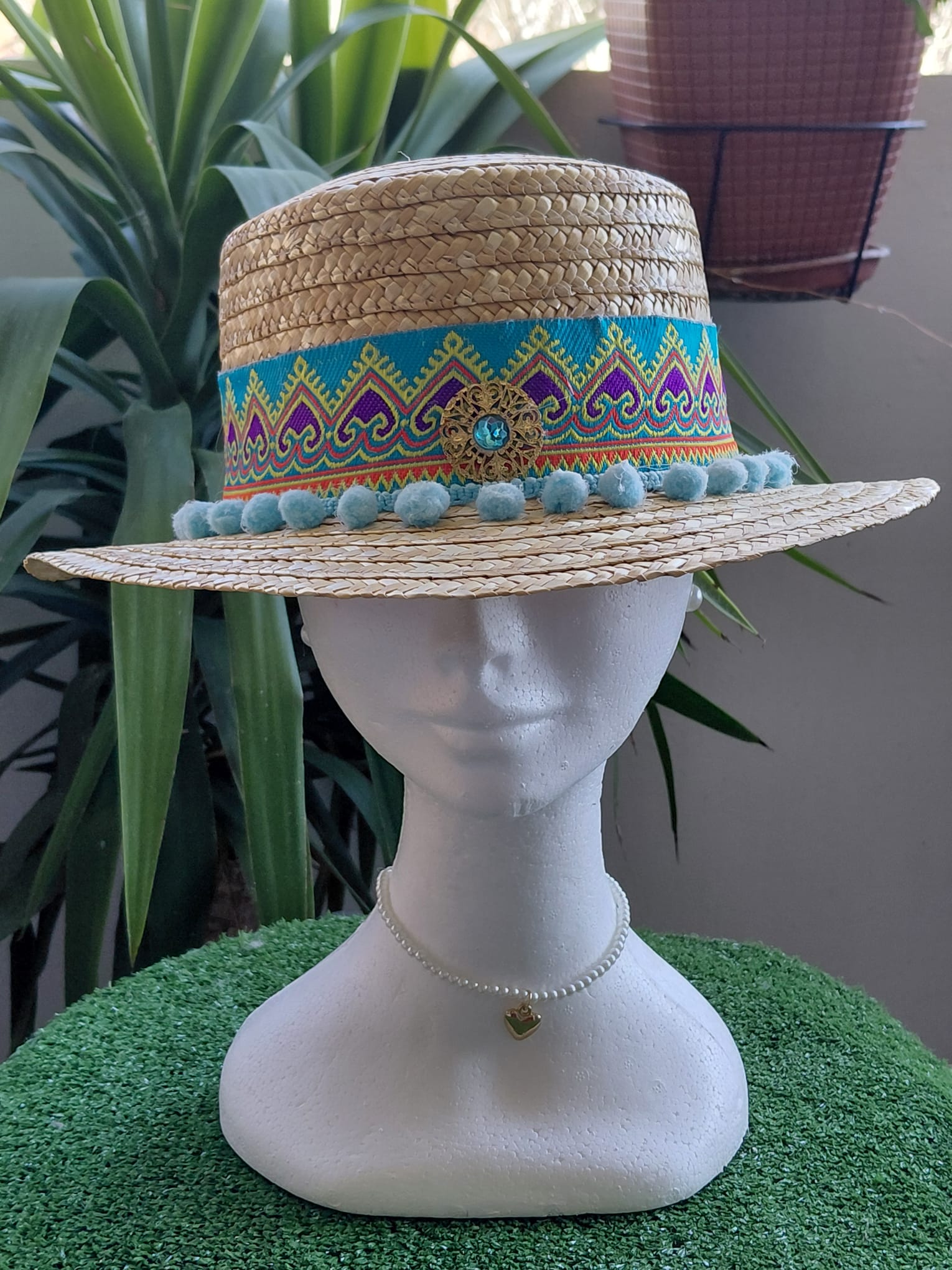Sombrero canutier con materiales: madroños de algodón turquesa claro, tira fantasía y aplique metálico dorado con pedrería