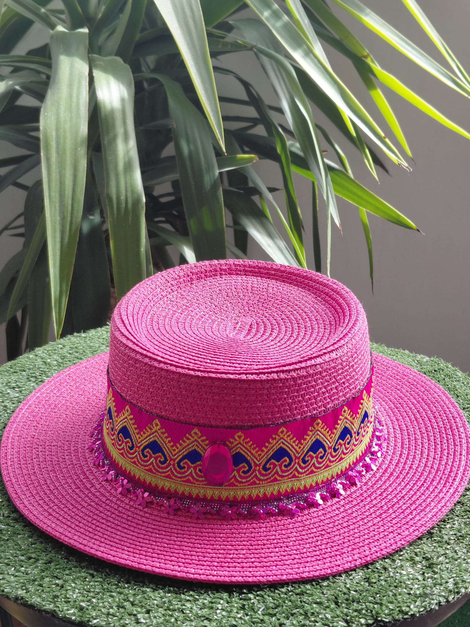 Sombrero canutier fucsia con tira de lentejuelas con pedrería y banda ancha multicolor fantasía
