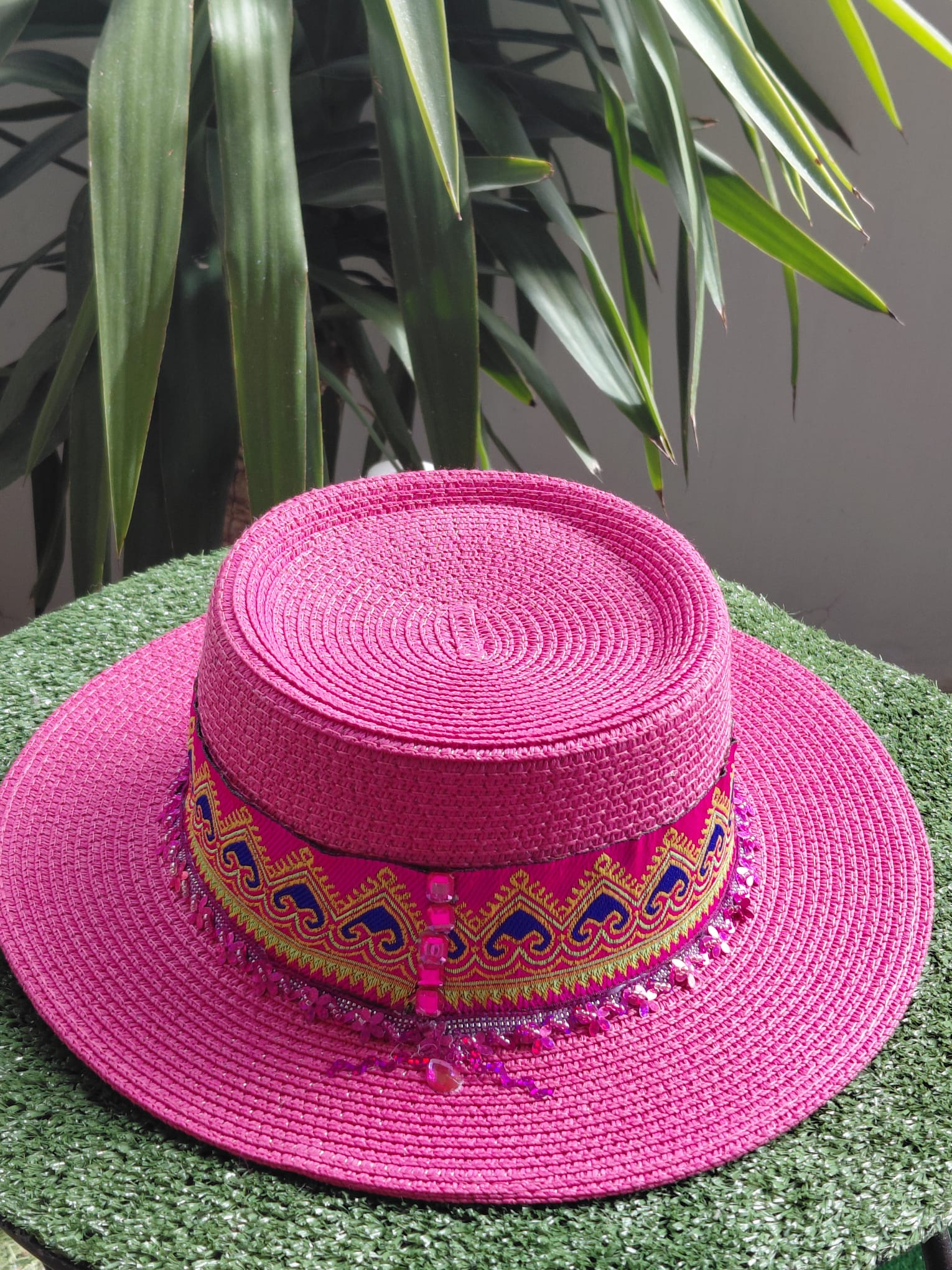 Sombrero canutier fucsia con materiales: tira de lentejuelas con pedrería y banda ancha multicolor fantasía