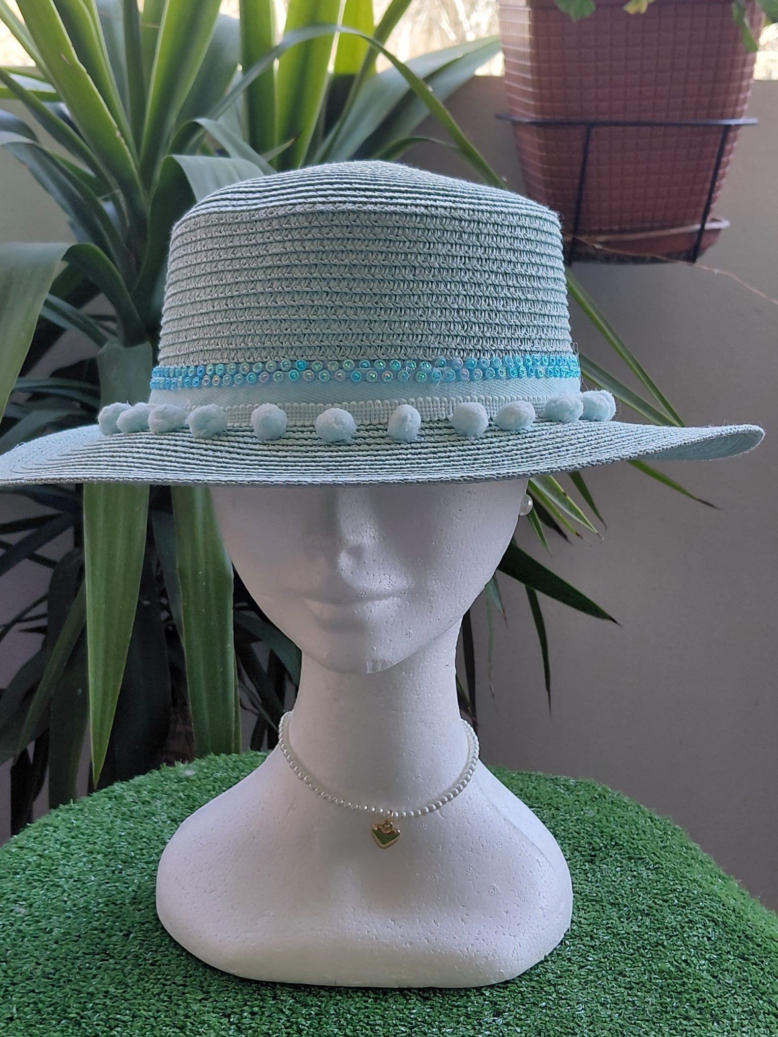 Sombrero canutier verde agua con materales: madroños de algodón a tono, pedrería verde agua y tira de algodón