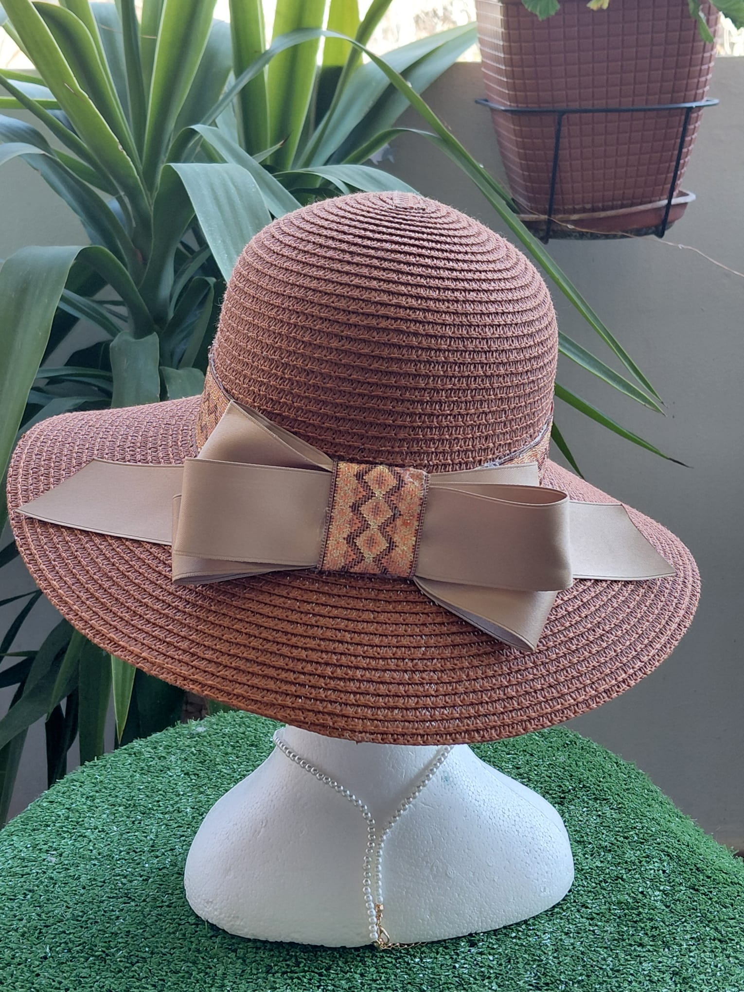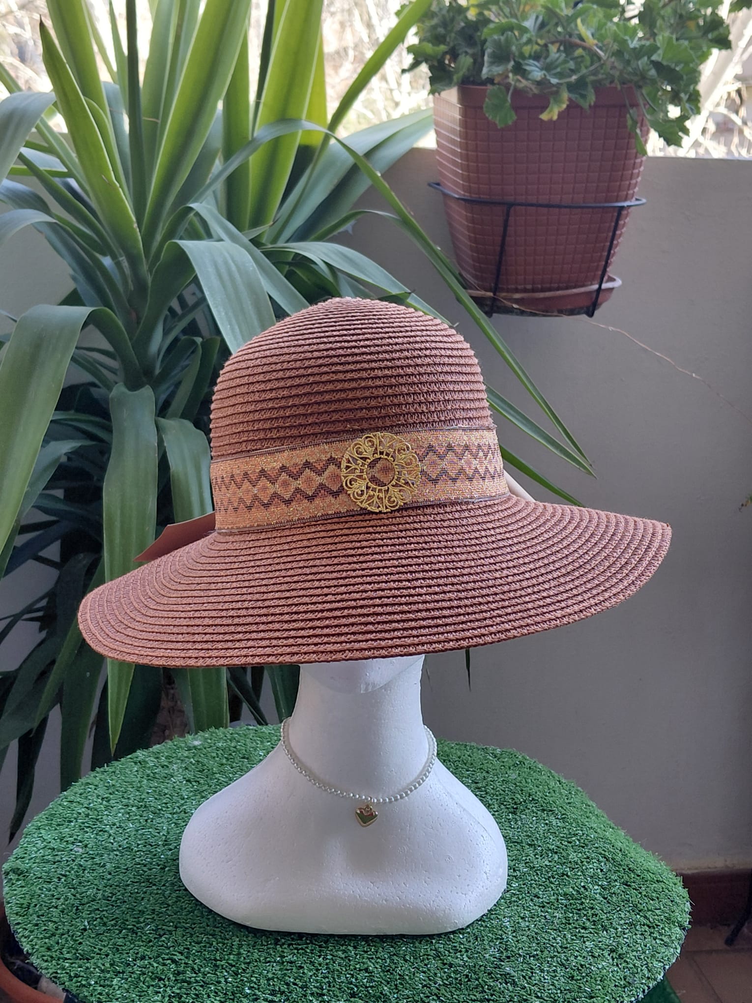 Sombrero con materiales: cinta de raso, cinta fantasía a tonos y aplique dorado con pedrería