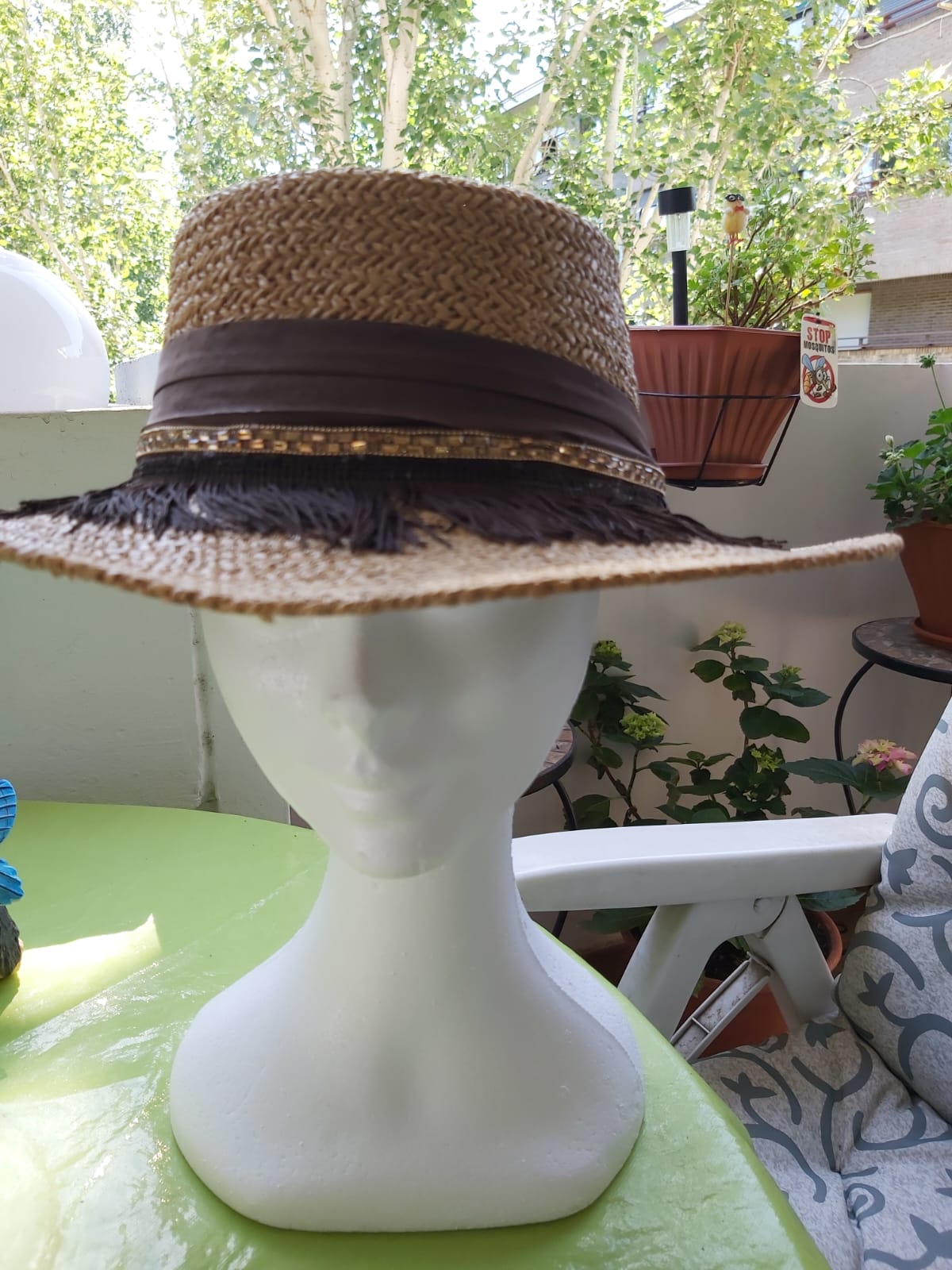 Sombrero en tonos chocolate con materiales: flecos, tira de strass ámbar y tira ancha de gasa