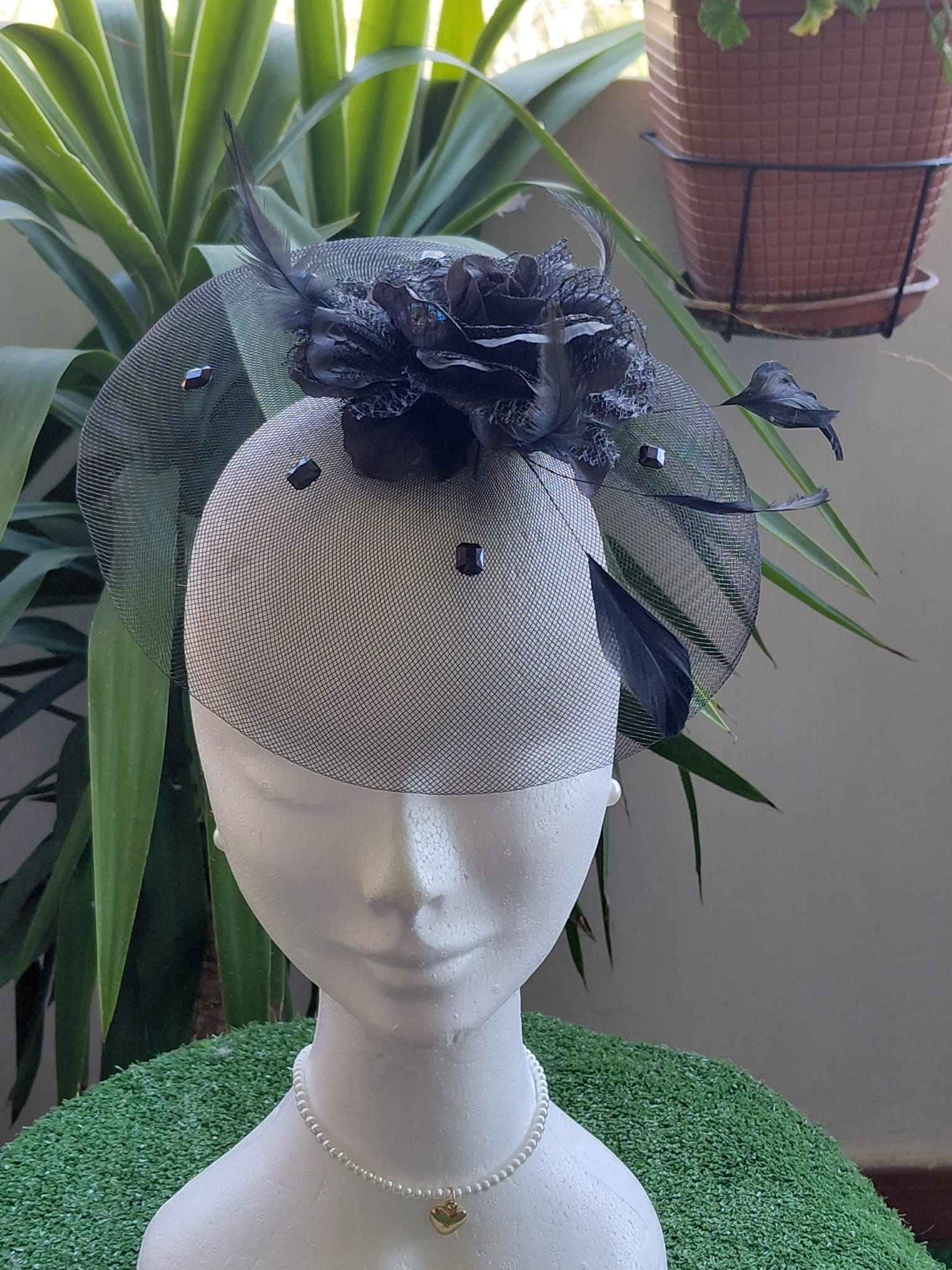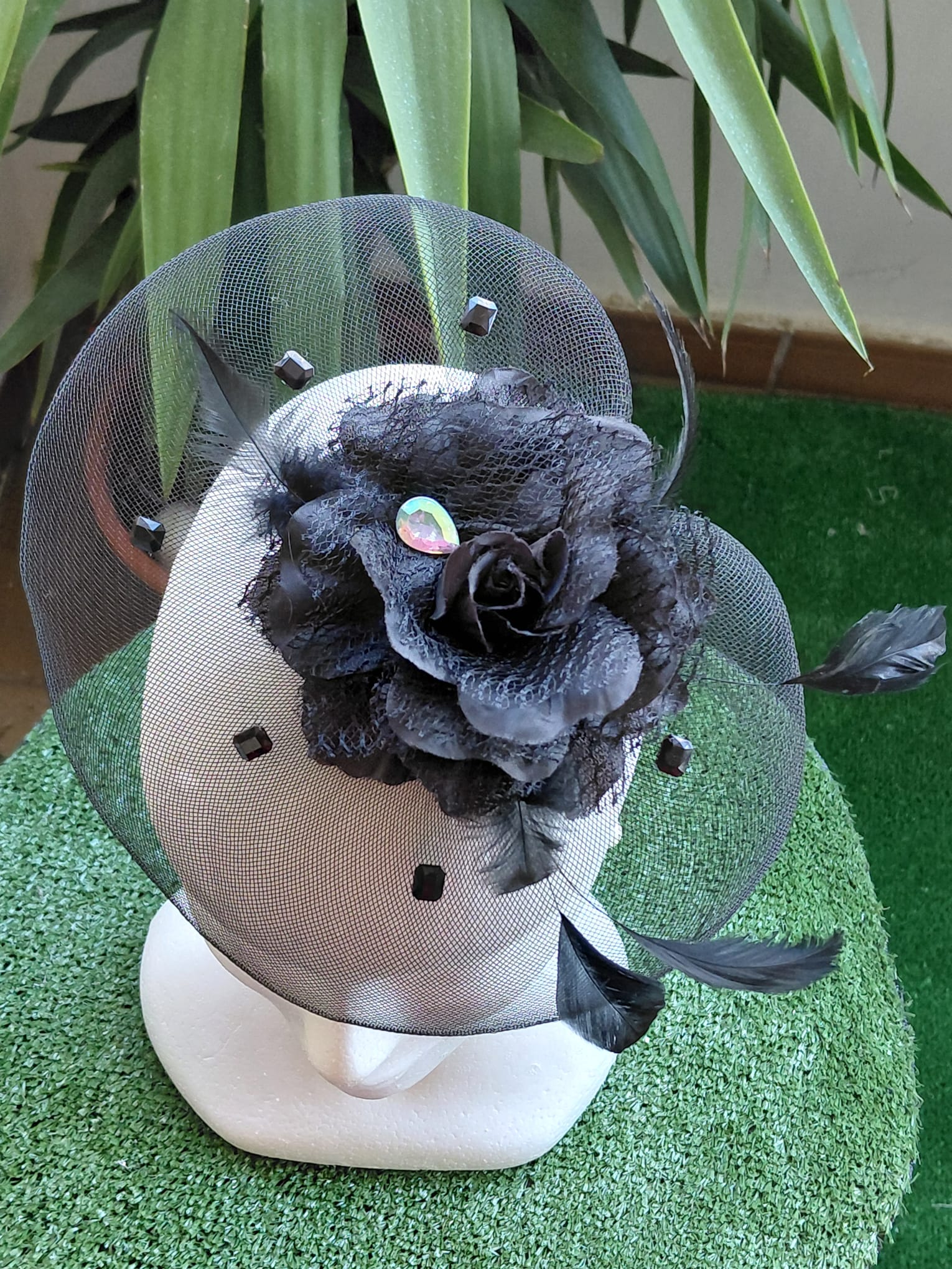 Tocado negro de rejillas con materiales: flor de tela negra, pedrería, plumas